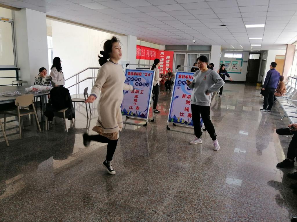 为庆祝“三•八”国际劳动妇女节,丰富学院女教职工文化生活,关注女教职工身心健康,营造“扛起新使命,一起向未来”的良好氛围,西瓜看球 分工会于3月7日中午在仙林校区德经楼五楼大厅组织“面向未来 快乐生活”女教职工踢毽子、跳绳比赛。