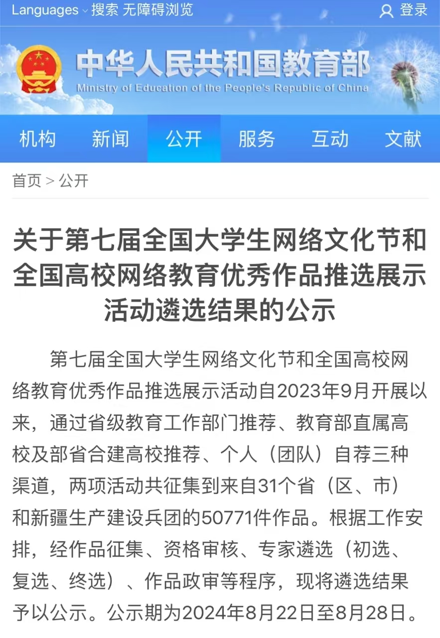 据悉,第七届全国“大学生网络文化节”和“全国高校网络教育优秀作品推选展示活动”自20239月开展以来,通过省级教育工作部门推荐、教育部直属高校及部省合建高校推荐、个人(团队)自荐三种渠道,两项活动共征集到来自31个省(区、市)和新疆生产建设兵团的50771件作品。根据遴选结果,江苏高校拟获奖133项,其中,江苏高校共有9篇网文作品和8篇工作案例入选。