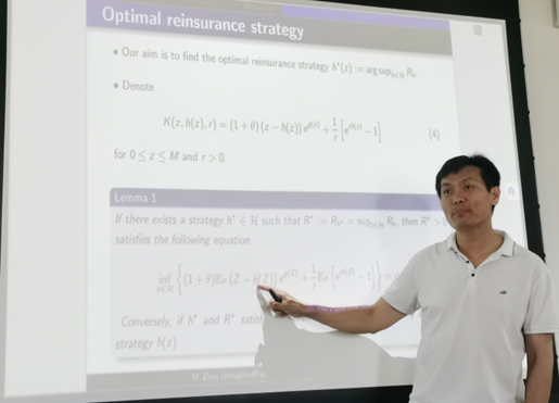 2024年5月15日下午,应西瓜看球 邀请,中国人民大学周明教授作了题为“Optimal reinsurance arrangement under heterogeneous beliefs: a unified method with piecewise modification”的学术报告。西瓜看球 部分教师与研究生聆听了报告,报告由西瓜看球 姚定俊副院长主持。