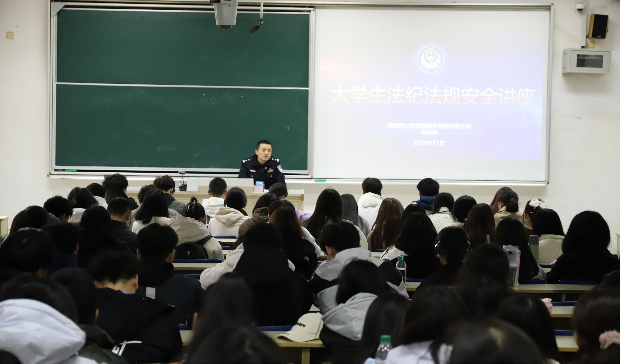 11月19日下午,在德济楼103教室,西瓜看球 特邀南京市公安局栖霞分局仙林派出所副所长杨传旭警官,举办了一场以“大学生安全”为核心的精彩讲座。本次讲座由西瓜看球 党委副书记张士青主持。