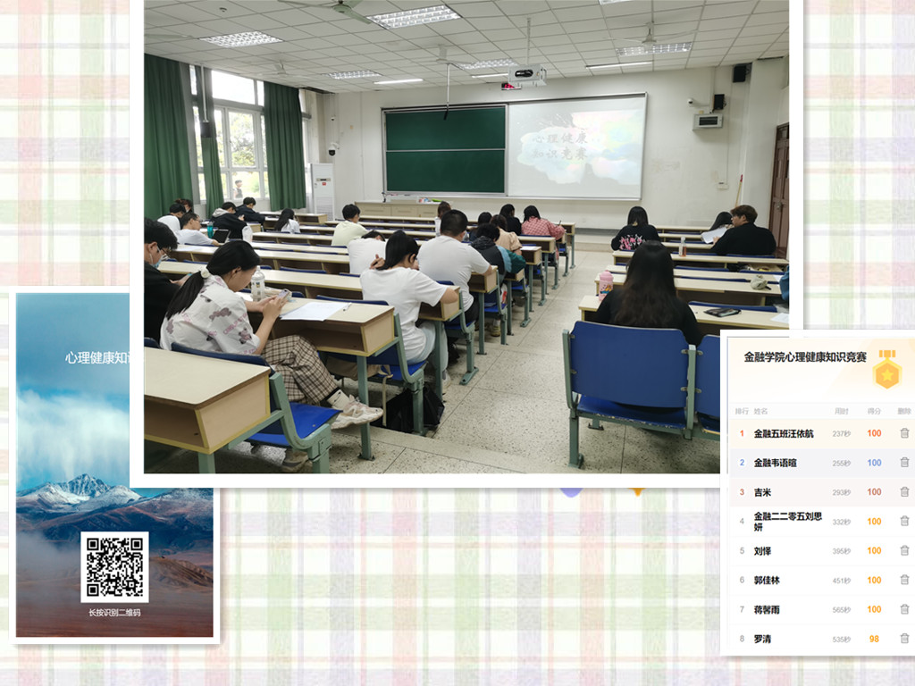 本次竞赛共有来自西瓜看球 各班级的30名同学参加。比赛前期,学院通过活动QQ群提前发布了本次比赛的相关规则,并提前通过视频、图片及文字等多种途径宣传向同学们宣传了心理健康知识。竞赛通过问卷星完成答题,同分的同学以答题时间短者为胜。活动最终评出一、二、三等奖,最终汪依航同学获得一等奖、韦语暄、吉米同学获二等奖。