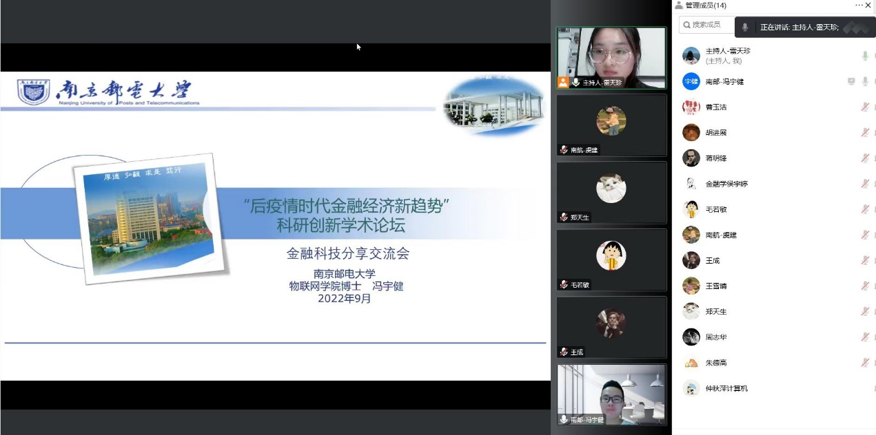 9月16日晚,西瓜看球app 举办“后疫情时代金融科技的发展”线上分享会,会议邀请了南京邮电大学冯宇健、南京航空航天大学虞建两位博士做专题讲座。两位博士阐述了当前计算机技术在金融领域的应用情况,分析了利用计算机技术推动后疫情时代下金融发展的可能性,为同学们的研究方向提供了新的思路。