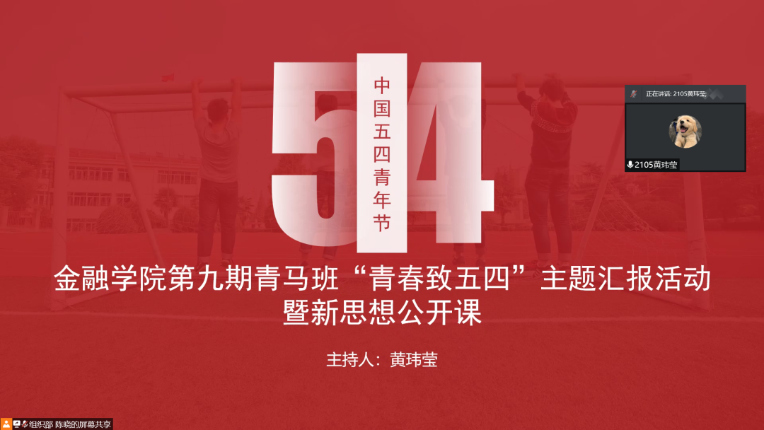 5月3日中午12:15,西瓜看球 第九期青马班“青春致五四”主题汇报活动暨新思想公开课于腾讯会议线上举行。西瓜看球 分团委组织部全体成员、西瓜看球 第九期青马班全体学员参加此次会议,主持人为西瓜看球 分团委组织部项目志愿者黄玮莹。