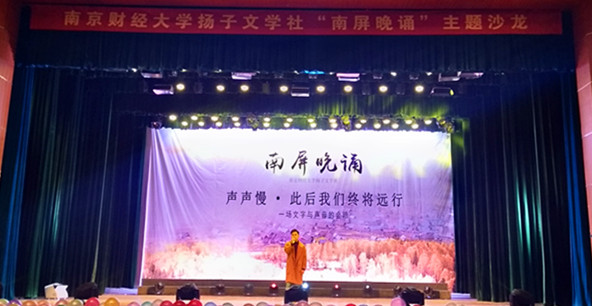 12月9日晚,由我校扬子文学社主办的“南屏晚诵”主题沙龙活动在仙林校区大学生活动中心礼堂浓情举办。金融院学生会主席杨颖、扬子文学社社长程瑶以及来自我校红山学院心翼文学社、东南大学东南风文学社等高校文学社代表们担任活动评委。相关职能部门负责人和我校部分学生观看了此次活动。