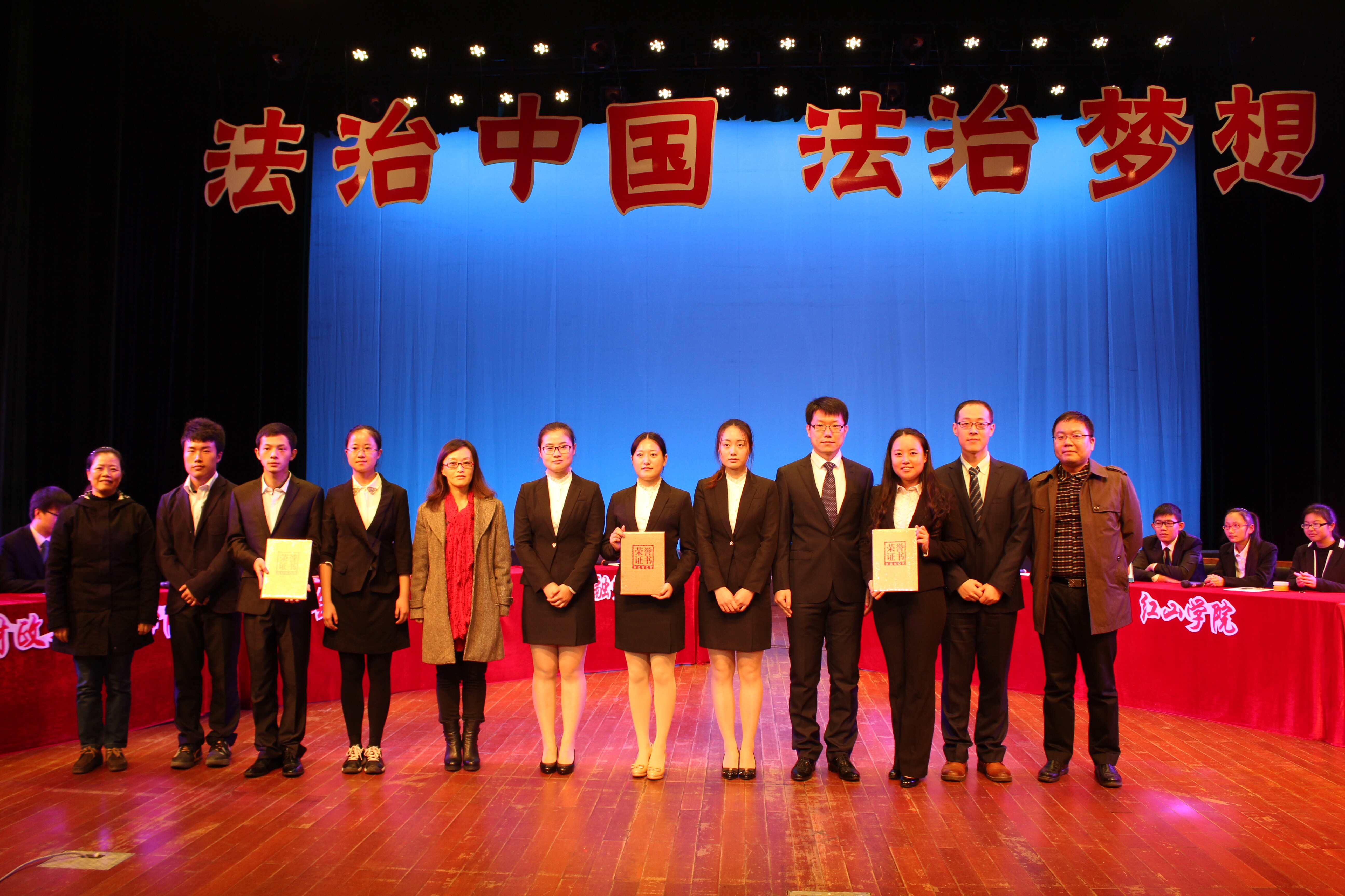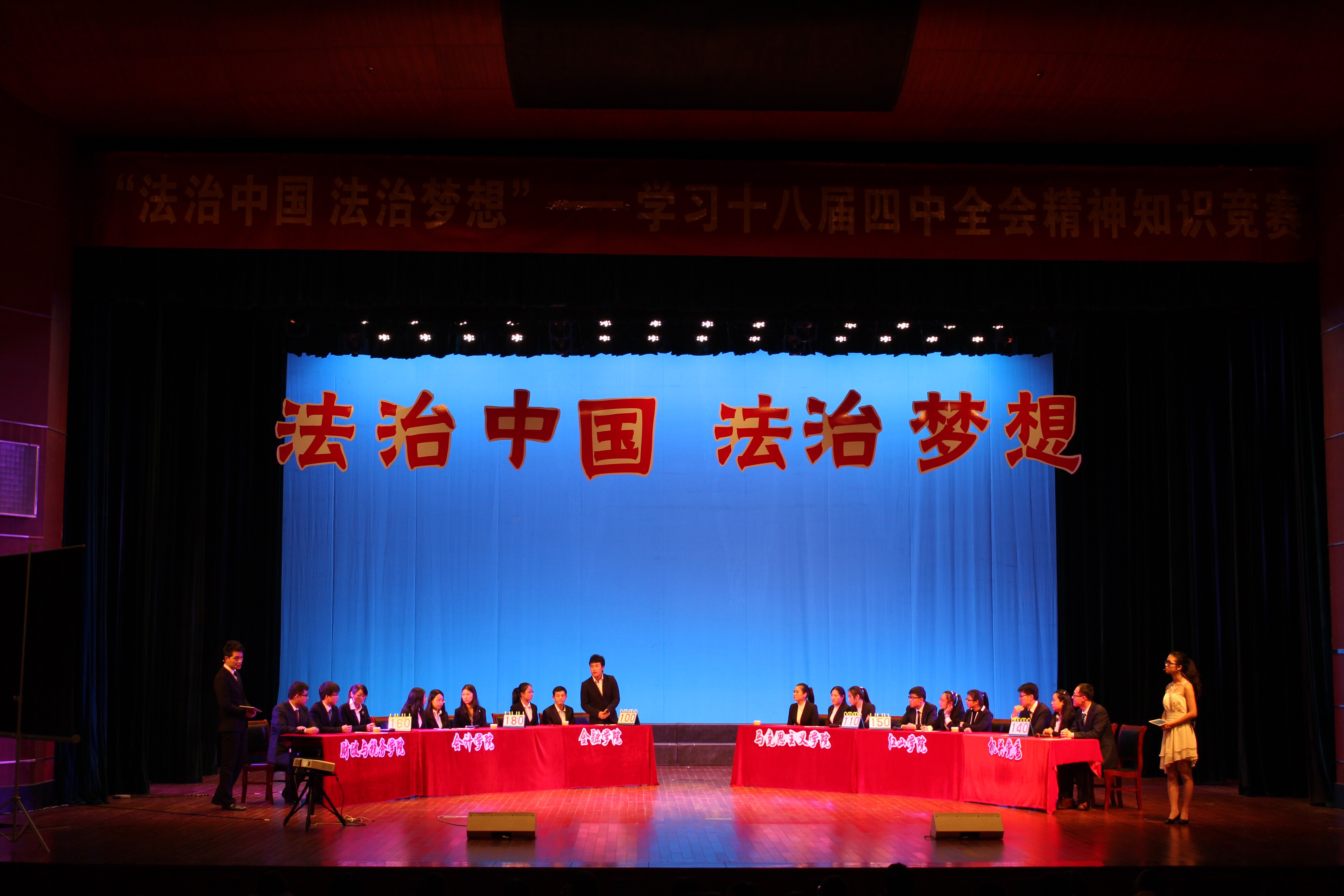 2014年11月27日南京财经大学“法治中国 法治梦想”——学习党的十八届四中全会精神知识竞赛决赛在南京财经大学大学生活动中心礼堂进行。经过初赛20个学院、机构代表队的激烈角逐,财经与税务学院、会计学院、西瓜看球 、马克思主义学院、红山学院和机关党委六支队伍晋级决赛。