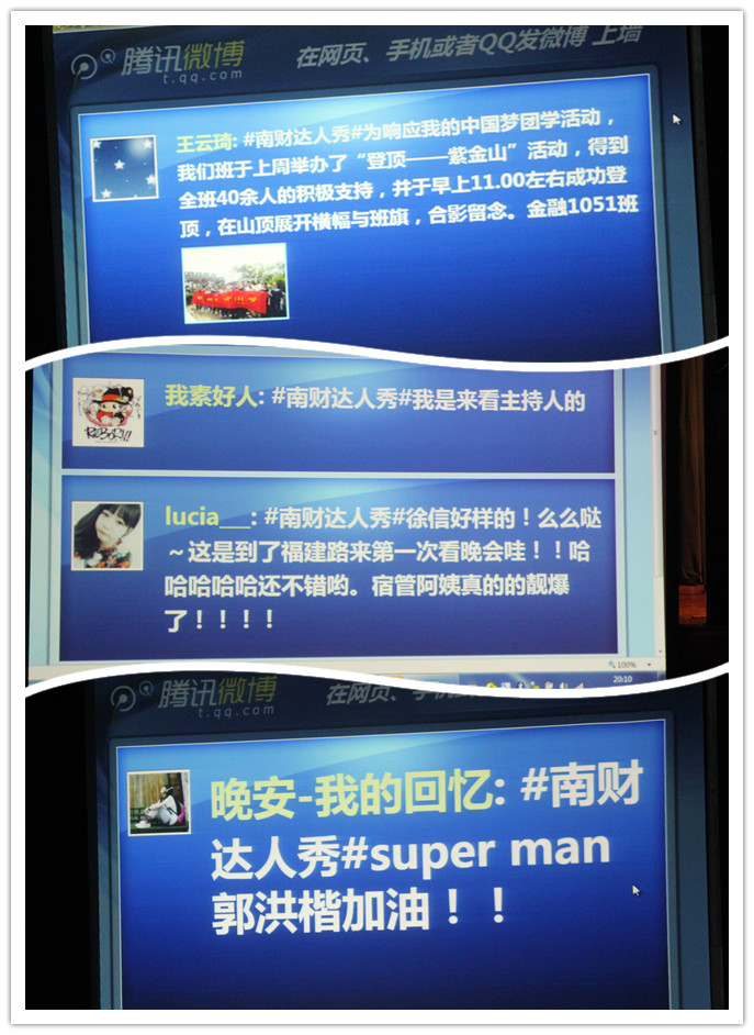 此次校园达人秀增设了微视频拍摄环节并开通现场腾讯微博互动,比赛开场播放了西瓜看球app 新闻部在仙林、桥头以及福建路校区拍摄制作的《幸福连连拍》视频短片,短片通过采访老师、学生、校职工,从多角度展现普通人的真实梦想,视频中出现众多同学们熟悉的老师、学长学姐以及宿舍阿姨、桥头校区的工作人员引起同学们的阵阵欢呼。