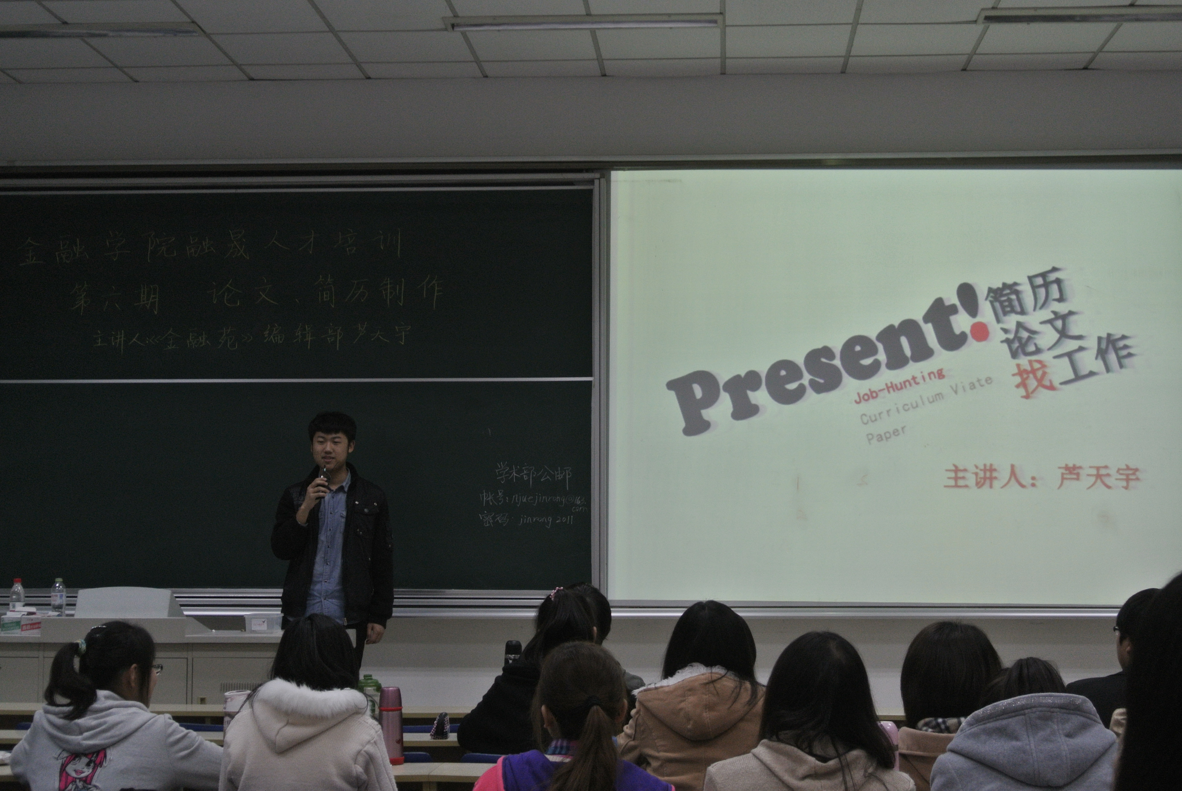 2013年3月19日晚18:30,西瓜看球 融晟人才培训第六期在我校经济学科楼117如期举行。本次培训主要由西瓜看球 《金融苑》编辑部的芦天宇同学讲述一些关于论文写作和制作简历的技巧与方法,帮助同学们为今后的求职之路打好基础。