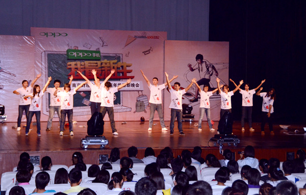 金属公社的《love》与《因为是傻瓜》掀开了晚会的序幕,四个大男孩的完美演绎博得了台下观众的一片欢呼叫好。那一刻,摇滚与抒情融合,掌声与欢呼与共。融煜剧社的《项羽外传》将“动车”、“穿越”、“还珠”等一系列网络热词融进了话剧。月光宝盒的三轮出场,把会场的气氛推向了一个又一个的高潮。当然我们的舞蹈更有看头。如果说福建路文艺部的现代舞透露着一股可爱学生风,那么食工院的《Ah》舞便充斥一股成熟与知性。本次晚会除了歌舞话剧,更增添了微博互动这一环节。这是南财在大活表演史上第一次加入微博。同学们的用指尖表达心中的激动,用文字传递着我们的喜悦。屏幕上不断更新的微博,足以表明新生们对金融的爱。知行学社的《我们欢聚知行》成功地将晚会推向了高潮。红星闪闪,nobody,兔子舞以串烧的形式展现在观众眼前。最后的那场类似千手观音的舞蹈更是令全场都hold不住。风趣的表演是社友们活力的象征,搞怪的舞蹈是社友们青春的标志。压轴的演出使得晚会在欢声笑语中完美谢幕。