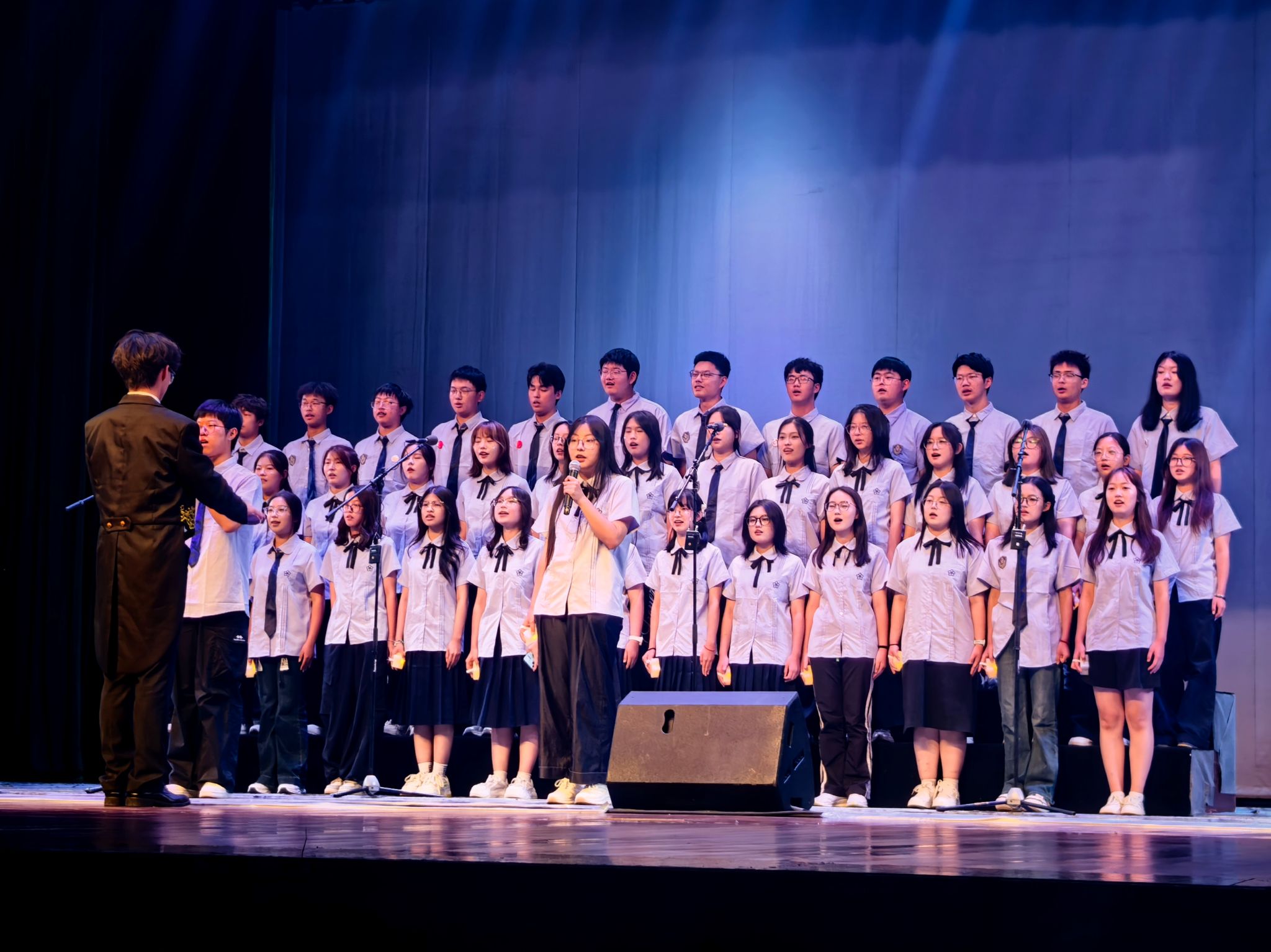 舞台上,新同学们精神饱满,意气风发。他们用嘹亮的歌声、深情的演绎和富有创意的编排,展现了金融学子的蓬勃朝气与家国担当。男生们声音浑厚有力,女生们声线清澈悠扬,和谐的和声、整齐的动作、饱满的情绪,一次次点燃现场气氛。背景屏幕配合着歌曲主题播放着精心制作的画面,或展现祖国壮丽山河,或描绘阖家团圆温馨,或呈现青年奋斗图景,为歌声增添了强烈的感染力。礼堂内歌声飞扬,掌声雷动,浓浓的爱国情与节日喜庆氛围相互交融。