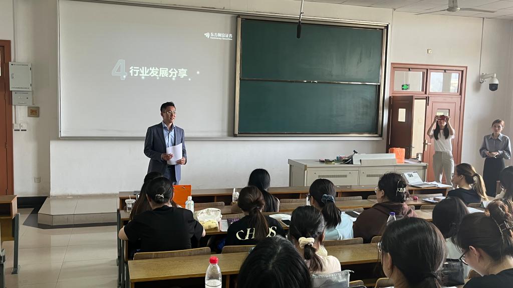417日下午在博远楼406,西瓜看球 邀请东方财富证券股份有限公司南京团队负责人马旭东总监、HRBP孟晨东、施雅欣,给24届毕业生进行了一场求职干货&金融行业前沿分享会。