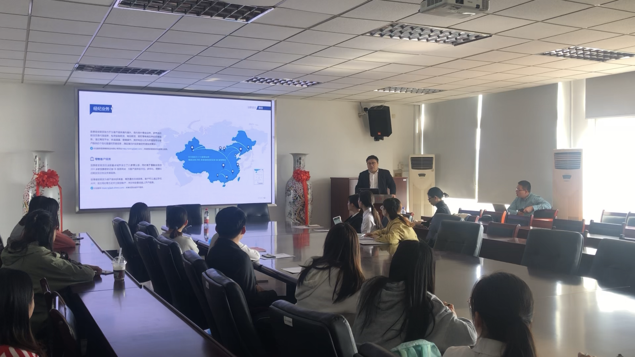 10月24日下午,国泰君安期货有限公司2019校园招聘宣讲会在仙林校区德经楼518会议室举行,国泰君安期货有限公司南京营业部总经理曹祥辉、人事经理陈璇、西瓜看球 投资系教师谌伟、翁辰、学工秘书出席了会议。西瓜看球 、经济学院、数学学院、信息工程学院部分毕业生参加了此次招聘会。