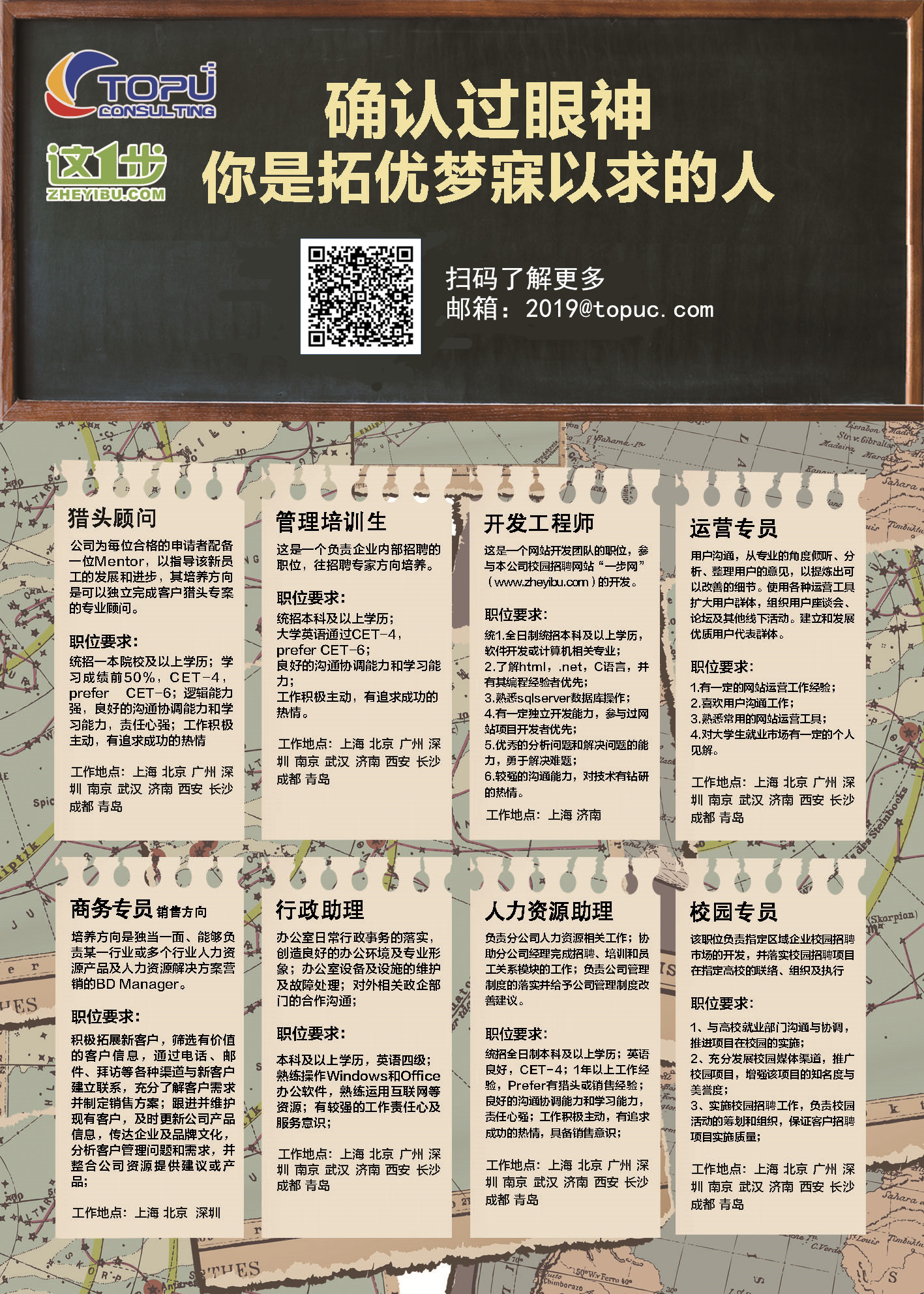 6、 校园运营发展专员:该职位负责指定区域企业校园招聘市场的开发,并落实校园招聘项目在指定高校的联络、组织及执行 工作内容: 1、根据公司业务发展战略及本部门的经营目标,执行本区域企业校园招聘市场开发计划及具体的实施方案,促进公司及产品品牌的提升; 2、了解当地企业客户校园招聘需求动态,挖掘潜在客户,实现本区域的市场目标; 3、与高校就业部门沟通与协调,推进项目在校园的实施; 4、充分发展校园媒体渠道,推广校园项目,增强该项目的知名度与美誉度; 5、实施校园招聘工作,负责校园活动的筹划和组织,保证客户招聘项目实施质量; 6、改善高校毕业生就业质量,向其提供专业的就业辅导。 工作地点:北京、上海、广州、武汉、成都、济南、长沙、青岛、南京和西安。