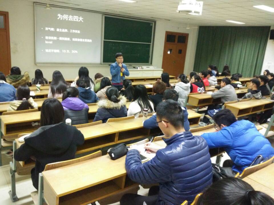 2017年3月17晚18:30,西瓜看球 青年互助服务中心于教C204举办“爱分享”系列讲座之面包求职干货分享会活动,此次活动邀请了“北大群面大神”刘思毅主讲,他为同学们分享了面试求职、制作简历、商务礼仪以及职业规划等方面的经验,同时对于四大,投行,PE等五百强企业做出重点介绍。主讲人还对部分讲座现场同学的简历进行了指导与修改并回答了现场同学的提问。