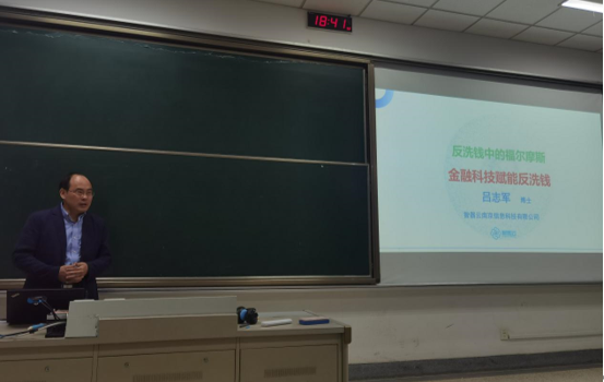 吕博士首先从反洗钱监管形势着手分析,为同学们特别介绍了反洗钱金融行动特别工作组“FATF”的组织架构、主要合作领域和FATF黑名单等,带领同学们初步认识了FATF。随后依据《中华人民共和国反洗钱法》、《金融机构反洗钱规定》,吕博士针对我国反洗钱工作的进展深入剖析了国内金融监管状况。以地下钱庄类罪模型为例,吕博士接着为同学们阐释了反洗钱工作面临的挑战。讲座的最后,吕博士以反洗钱系统中四大关键技术“可视化分析技术”、“机器学习技术”、“建模技术”、“知识图谱技术”为引,向同学们着重讲述了金融监管科技及关键技术在反洗钱工作中的应用,大家对金融科技在反洗钱工作中发挥的作用都有了进一步了解。