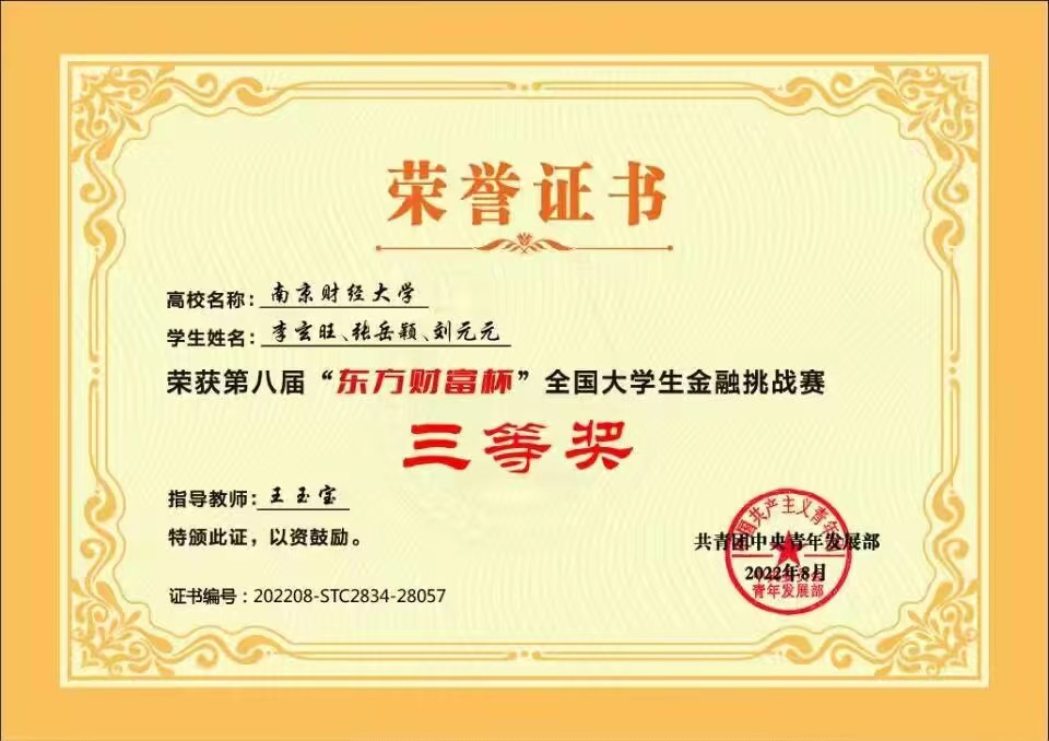 2月27日,由团中央青年发展部主办,全国学校共青团研究中心、东方财富信息股份有限公司和中央财经大学承办的第八届“东方财富杯”全国大学生金融挑战赛圆满结束。我校西瓜看球 学子获江苏省二等奖、全国三等奖。