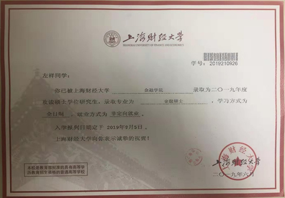 我的转专业之路比较坎坷,高考虽然有幸考取南京财经大学,但是没有录取到自己最喜欢的专业,入学后又因0.02个基点之差转专业失败。幸运的是我始终没有放弃对金融专业的偏爱和执着,在见到学校金融二学历的招生简章后我毫不犹豫的报了名。我的初衷是想通过对金融知识的系统性学习,将来进入金融领域工作,或者报考金融类研究生。在大三下学期我开始为报考上海财经大学金融硕士做准备,我很快发现绝大部分专业知识都在二学历的课堂学习过。作为一名跨考生,虽然整个备考过程比较艰辛,但因为之前在二学历课堂上打下了牢固的专业课,少了很多其他跨考生的焦虑和不安。我最终在报考上海财经大学金融硕士的1600多名考生中胜出,以初试第23名,复试第7名,综合第13名的好成绩成功录取。